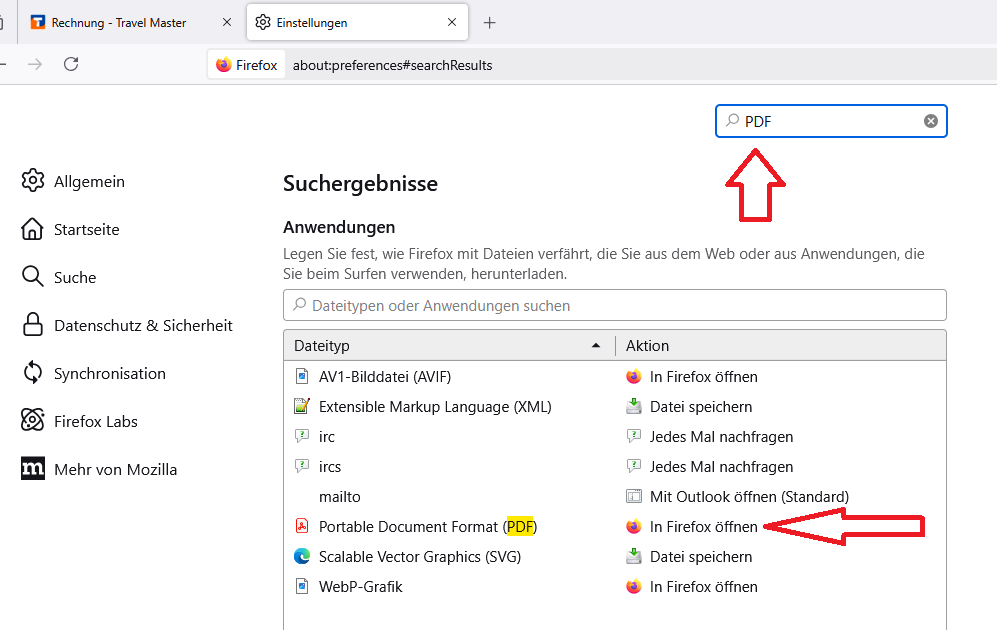 Das Problem liegt an der Einstellung für eingebettete PDF Dateien in Firefox. Folgendes muss unter den allgemeinen Einstellungen eingestellt sein, damit die PDF dargestellt wird: